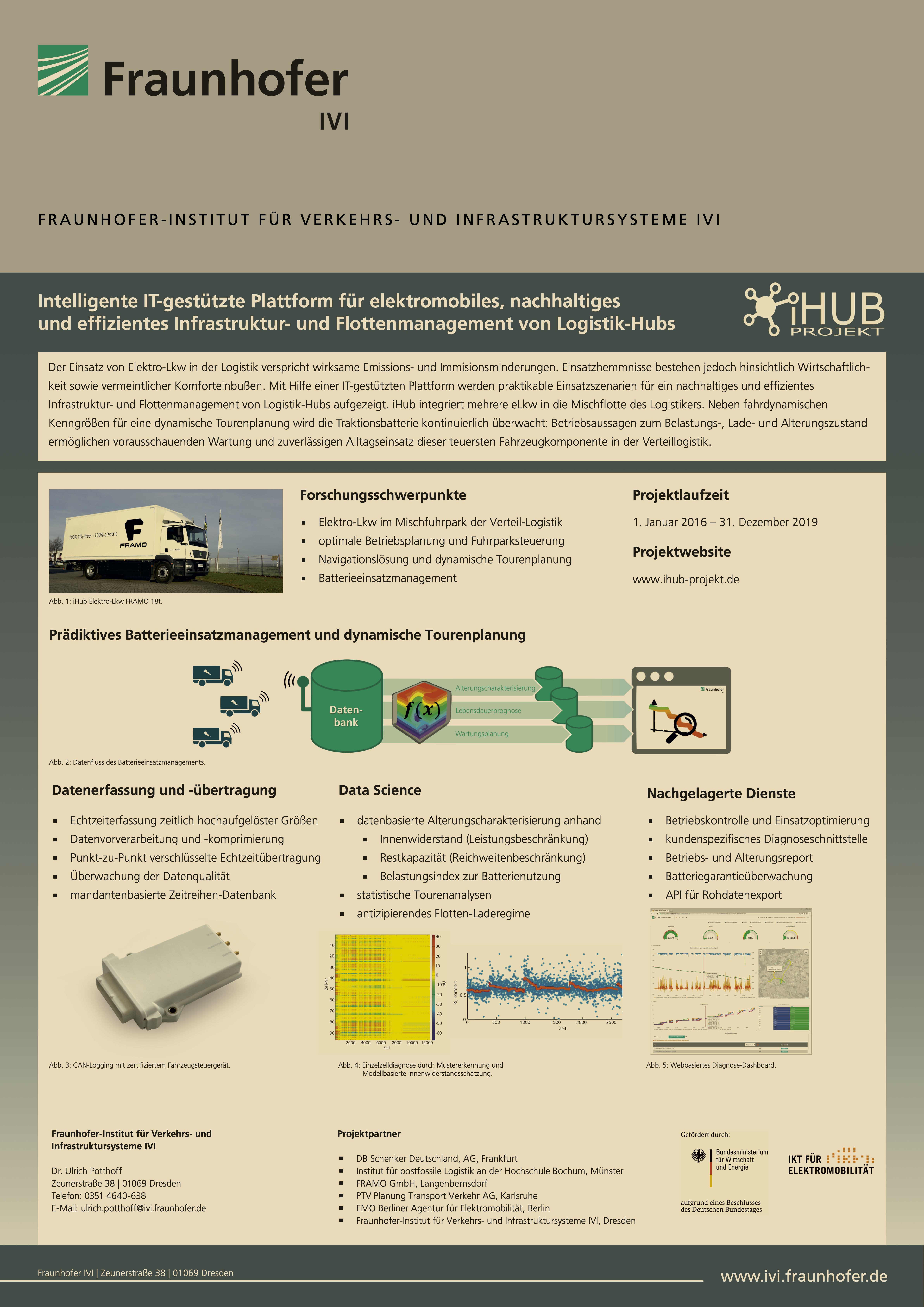 Elektrisch angetriebene Lastkraftwagen weisen im Vergleich zu dieselbetriebenen Lkw typischer Weise eine geringe Reichweite auf. Für ein Logistikunternehmen lohnt sich ihr Einsatz dann, wenn ein zentrales Flottenmanagement situationsbezogen entscheidet, ob ein Diesel- oder ein Elektro-Lkw für die jeweilige Tour besser geeignet ist. Batteriezustand, Ladeplanung und die Länge der Verteilrouten stellen dabei die wichtigsten Parameter dar. Eine prototypische IT-Plattform dafür aufzubauen ist zentraler Entwicklungsschwerpunkt des Projektes iHub. Dazu finden in einer gemischten Flotte drei Elektro-Lkw von mindestens 12 Tonnen zulässigem Gesamtgewicht Einsatz, die palettierte Frachten als Stückgut transportieren. Die Ergebnisse sollen anschließend auf größere Flotten übertragen werden.